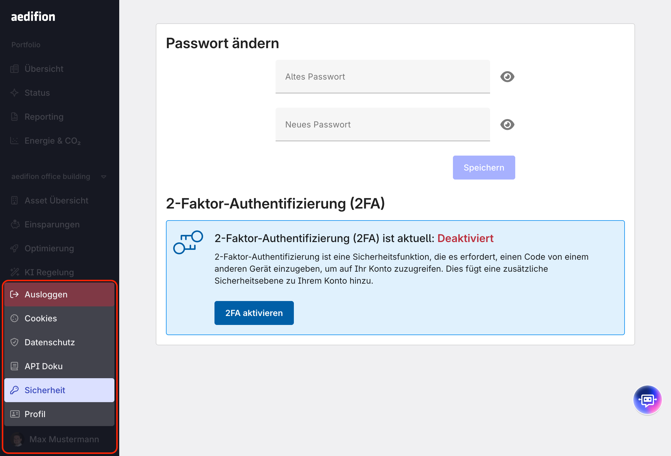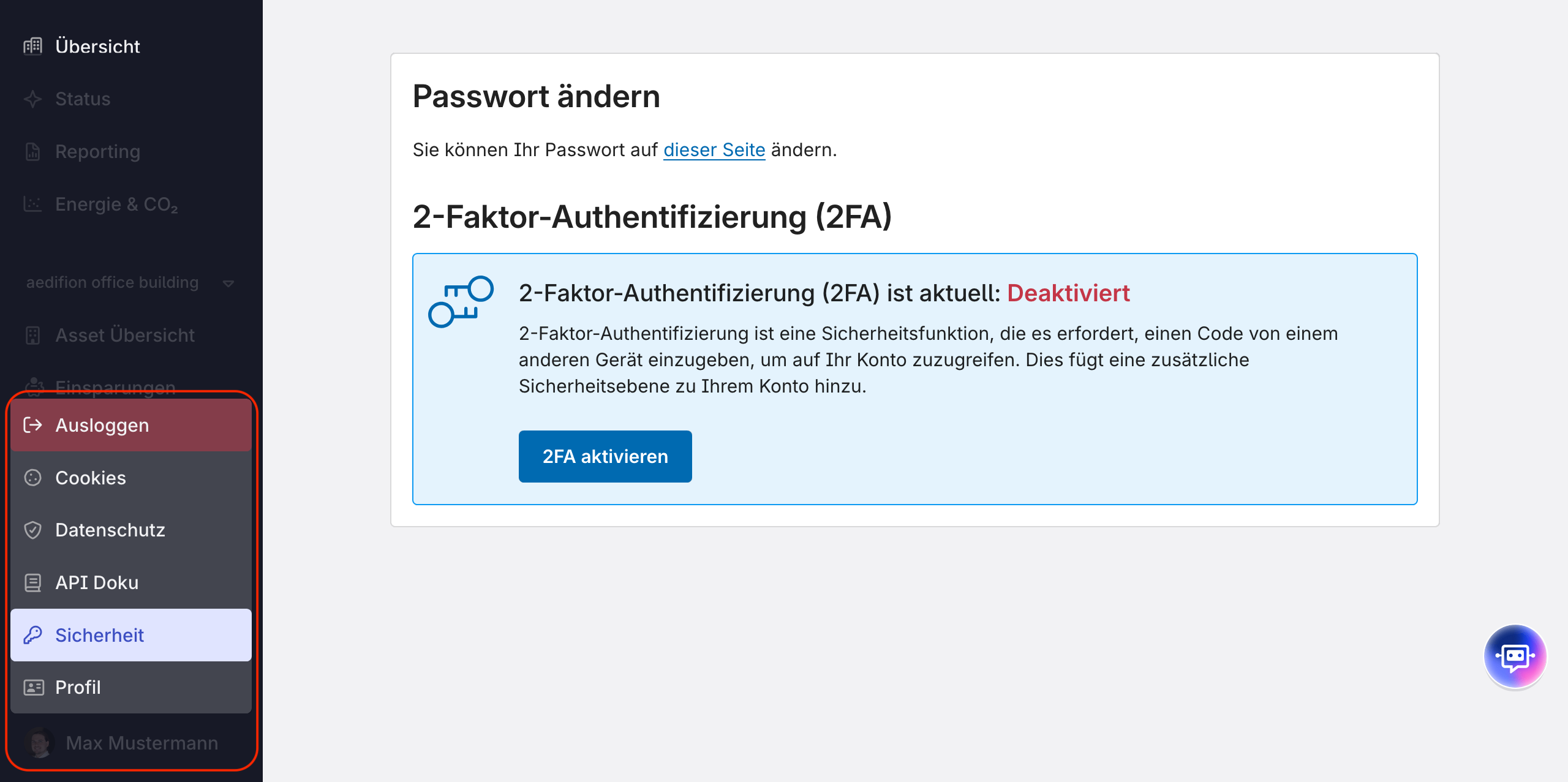 Um auf die Seite „Sicherheit" zuzugreifen, klicken Sie auf das Benutzermenü in der unteren linken Ecke und wählen Sie dann Sicherheit.