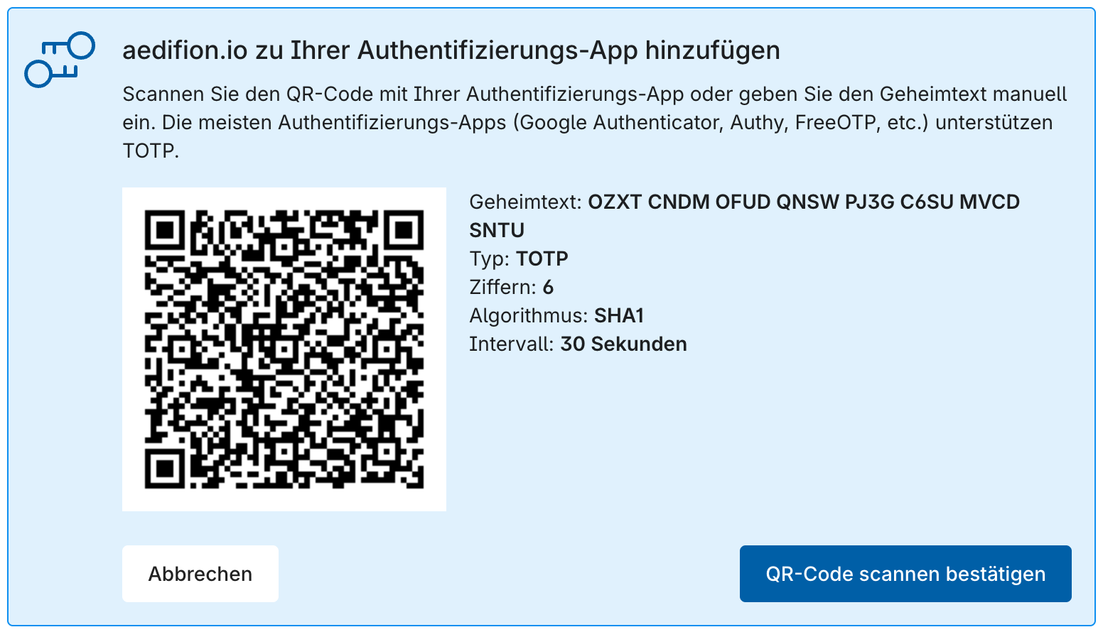 - Scannen Sie den QR-Code mit Ihrer Authentifizierungs-App (z. B. Google Authenticator, Authy oder FreeOTP).