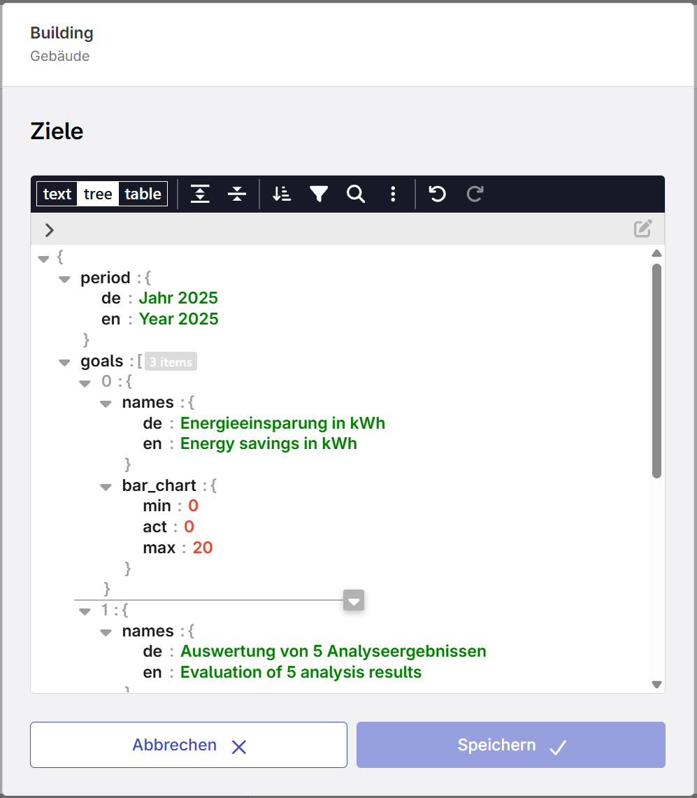 Damit die Ziele korrekt angezeigt werden ist es wichtig, dass die genaue Syntax für das JSON-Objekt eingehalten wird. Um das anlegen des Objektes zu vereinfachen ist unten ein eine Vorlage eingefügt, die einfach kopiert werden kann um sie dann in das Editor-Feld einzufügen.