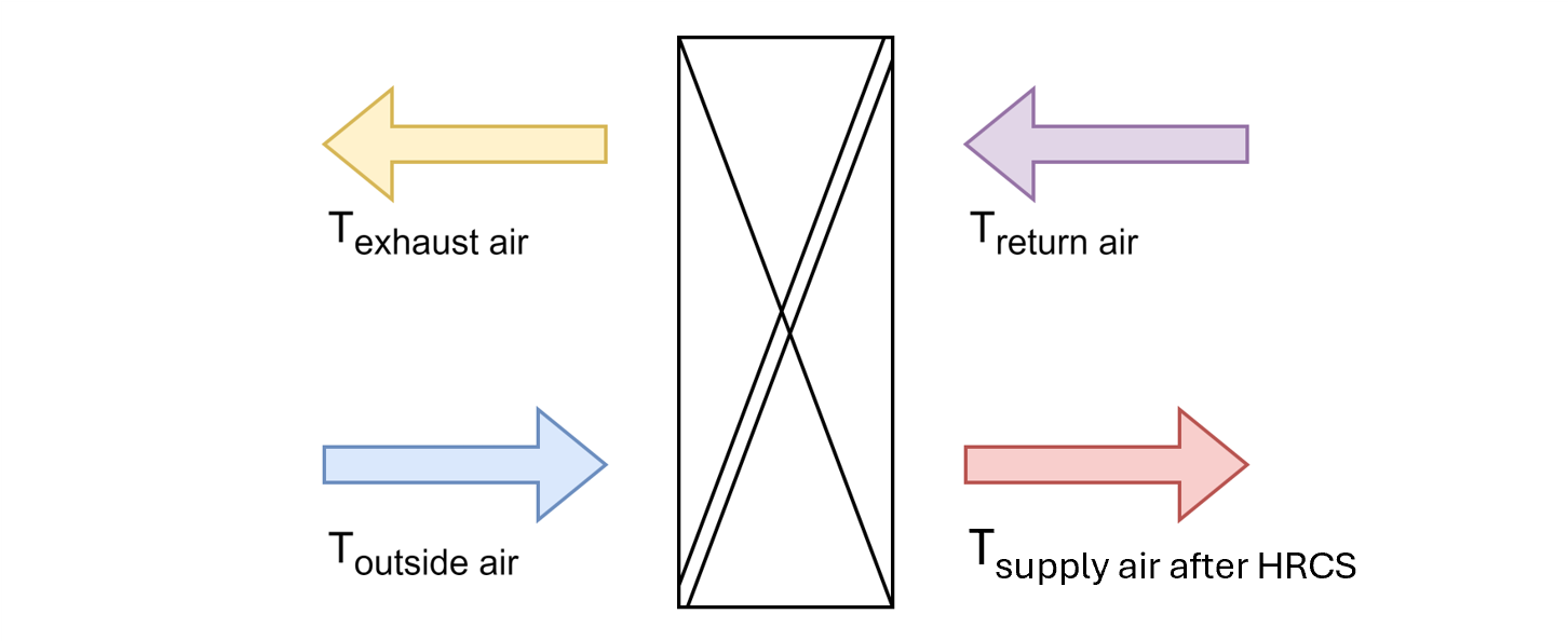 It uses temperature measurements of the airflows entering and leaving the HR system — return air, outside air, and optionally supply air after heat recovery or exhaust air — to calculate the actual temperature efficiency.