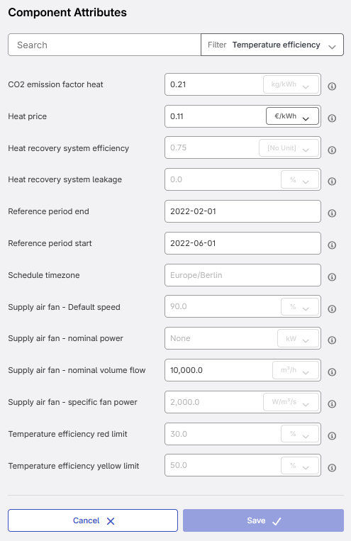 To calculate savings potential, information on the power or volume flow of the supply and/or return air fan must be available. Assign at least one of the following pins/attributes: