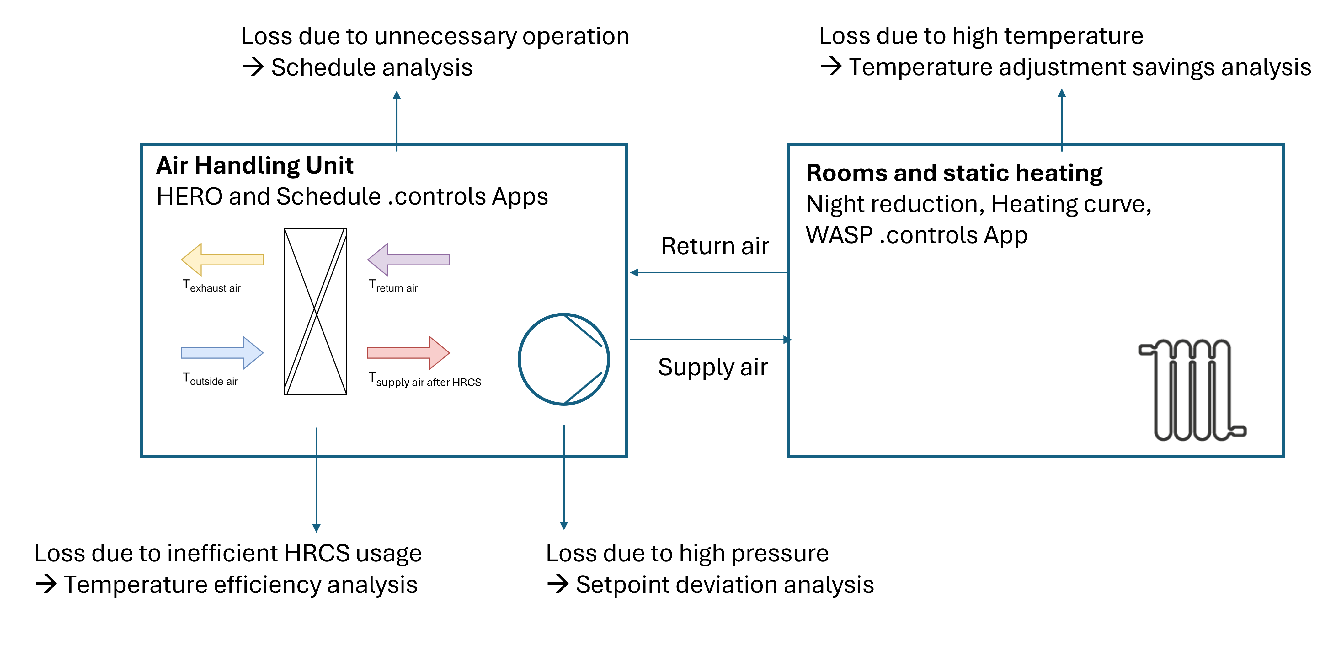 It should be noted that different measures can affect the same potential. For example, the HERO .controls app affects the supply air temperature and therefore also the room temperature. However, setting a night setback or heating curve or the WASP .controls app in the static heating also has an effect on the room temperature. In order to avoid obtaining a sum of potential savings that is too large due to these overlaps, there are dedicated analyses that evaluate the individual effects: